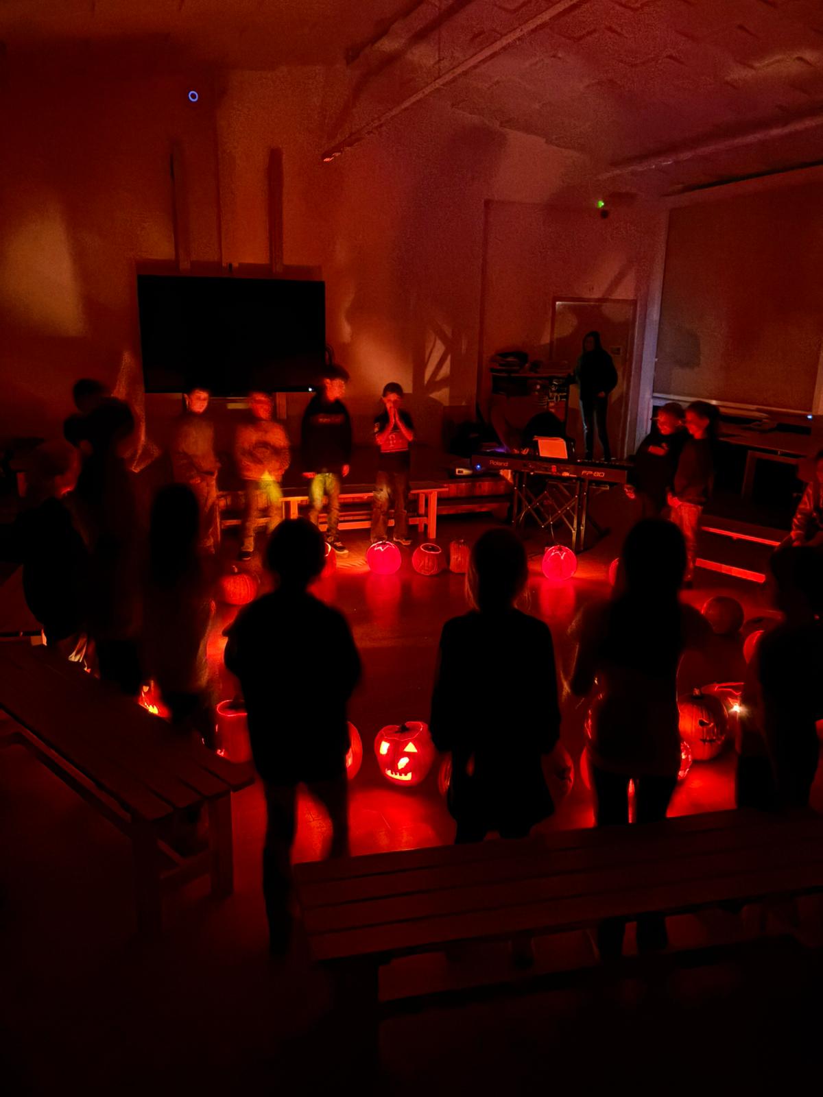Als schließlich alle Kürbisse fertig waren, stellten wir sie in der Aula in einem großen Kreis auf. Dann wurde das Licht ausgeschaltet – und plötzlich leuchteten überall die schaurig-schönen Kürbisgesichter. Die Stimmung war mystisch und gemütlich zugleich. Die Kinder der Klasse 3b sangen ein Herbstlied und führten anschließend einen gruseligen Halloween-Rap auf.